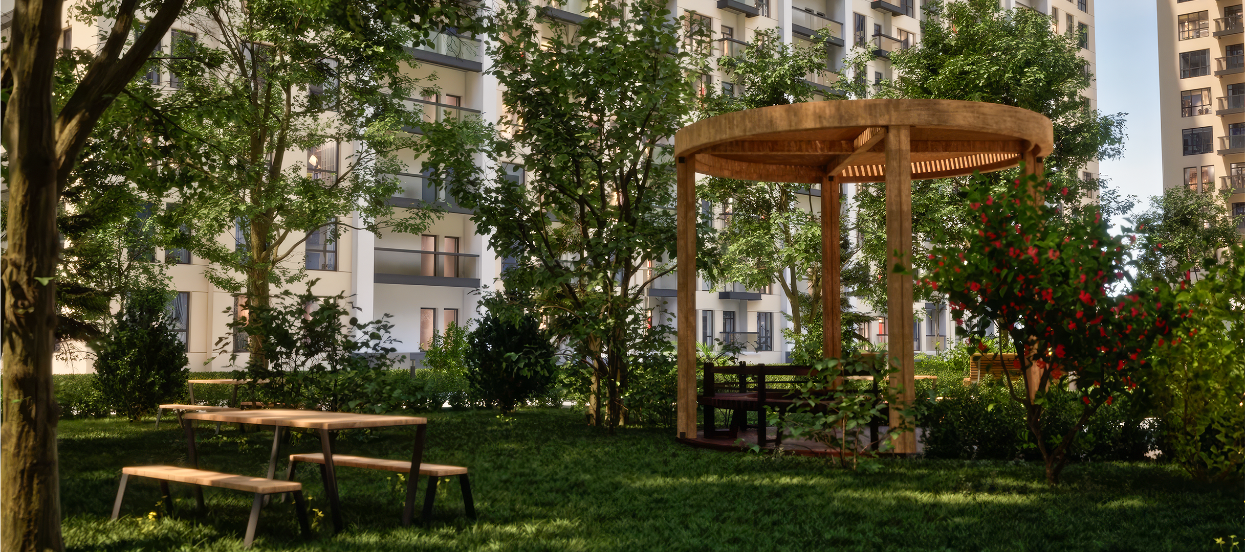 Həmçinin kompleksin həyətində geniş park zonası, uşaq meydançası və istirahət üçün sahələr nəzərdə tutulub. Yaxınlıqda bağça, məktəb və müxtəlif iaşə obyektləri yerləşir. Şoseyə və metro stansiyalarına yaxınlıq isə ictimai nəqliyyatdan rahat istifadə imkanı yaradır. Sakinlərin rahatlığı və təhlükəsizliyi üçün yeraltı dayanacaq, xüsusi mühafizə xidməti və kamera-nəzarət sistemi təmin olunacaq. Mənzillər isə sakinlərə tam təmirli və çıxarışlı şəkildə təhvil veriləcək.